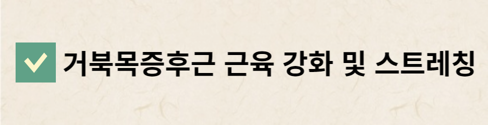 ◆근육 강화 및 스트레칭을 포함한 운동 치료: 목 앞쪽의 속 근육과 등 뒤쪽, 날개뼈 사이의 근육을 강화하고 늘립니다.