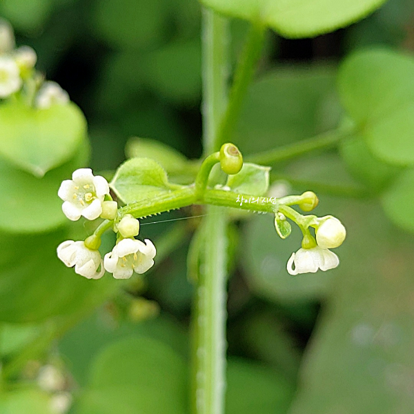 꽃은 7∼8월에 연한 노란색 꽃이 피며 지름이 3.5~4mm 정도로 4~5개로 갈라지고 잎 겨드랑이와 원줄기 끝에 원추꽃차례로 달리고 꽃자루가 짧다. 화관은 심장 모양이고 5갈래이며, 갈라진 조각은 끝이 뾰족한 바소꼴로 끝이 앞으로 굽는다. 수술은 5개이고 씨방에는 털이 없다. 열매는 꽃이 지고 난 뒤 장과로 둥근 열매가 2개씩 붙어 달리고 털이 없으며 9월 정도에 익으면서 검게 물든다.