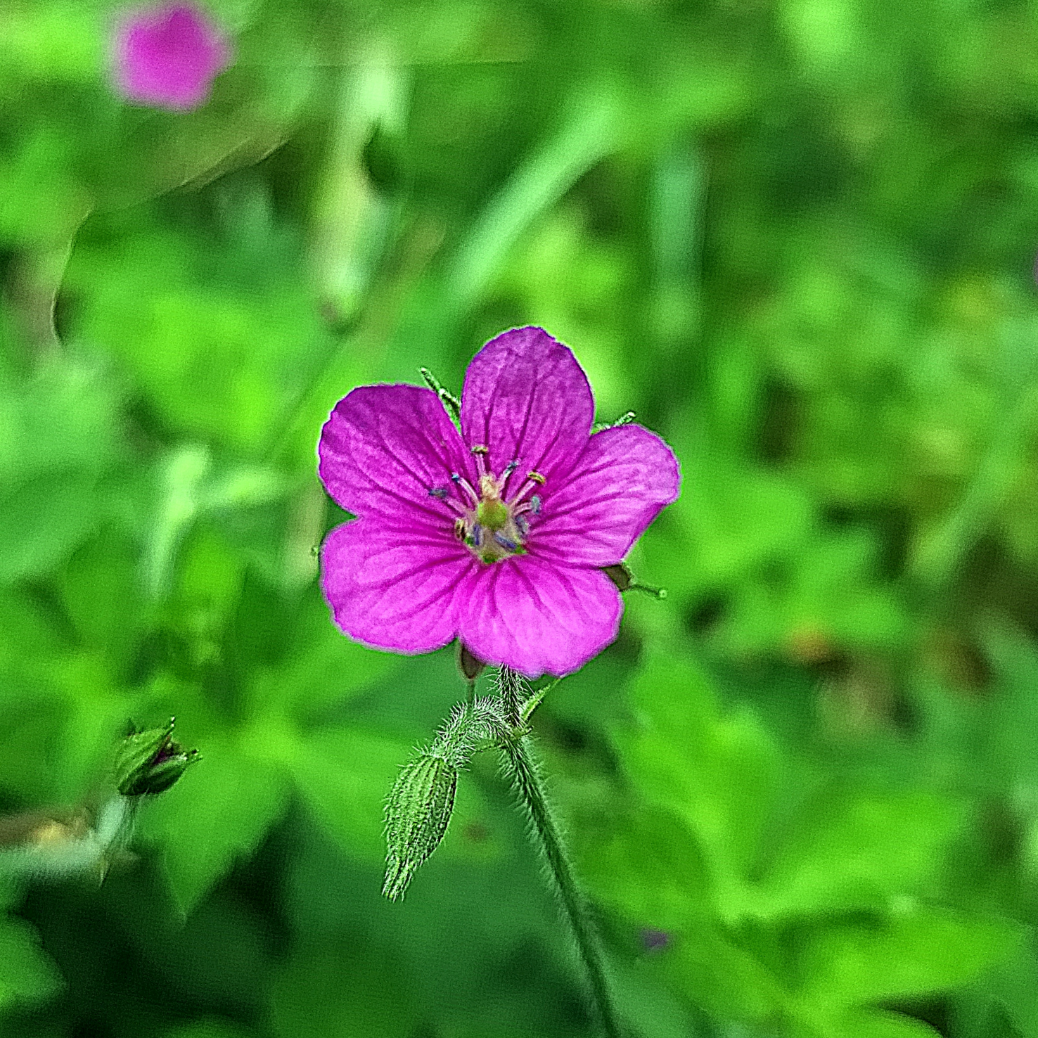 꽃은 연한 홍색, 홍자색 또는 백색이고 8월~10월에 피며 지름 1cm~1.5cm 정도로 화경에서 2개의 꽃자루가 갈라져 각 1개의 꽃이 달린다. 꽃자루와 꽃받침에 짧은 털과 더불어 퍼진 긴 샘털이 있으며 씨방에 털이 있고 암술머리는 길이 2mm 정도이다.