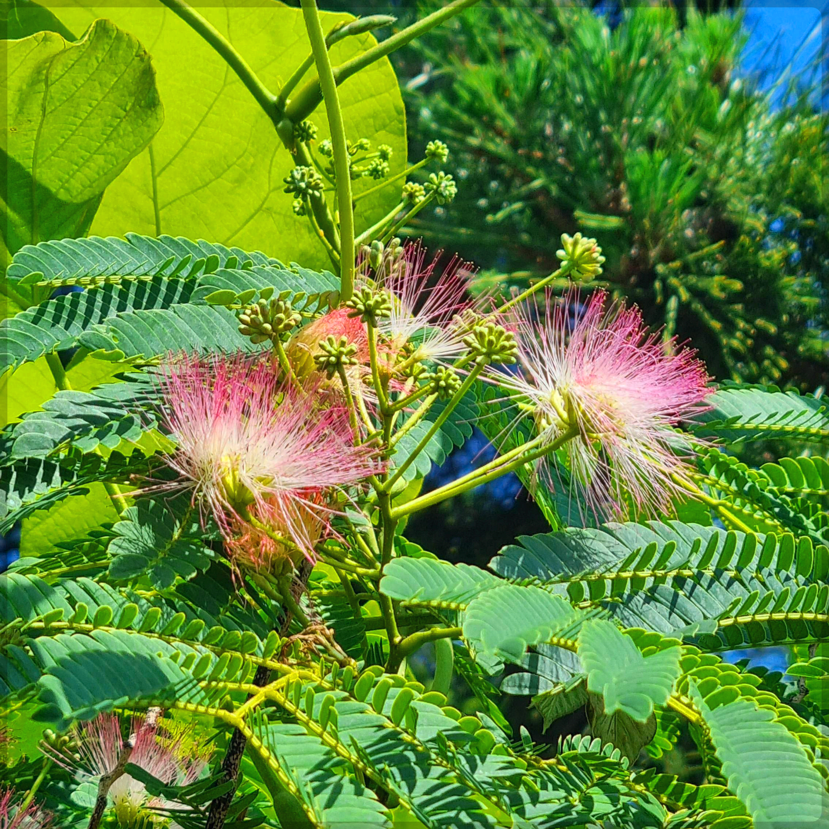 자귀나무는 꽃과 잎, 줄기, 열매까지 다양한 생태적 특징을 지닌 나무입니다. 특히 꽃은 마치 대낮의 불꽃놀이처럼 화려하게 피며, 공작새가 깃털을 펼쳐놓은 듯한 아름다움을 자랑합니다.